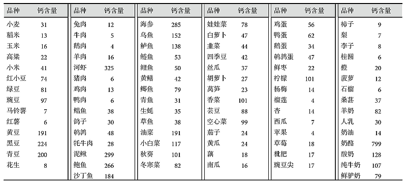 表1 中国居民常见食物中的元素钙含量(mg/100 g)