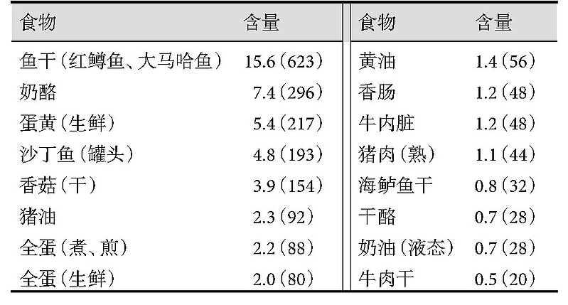 表2 常见食物中普通维生素D含量[μg(IU)/100 g可食部]