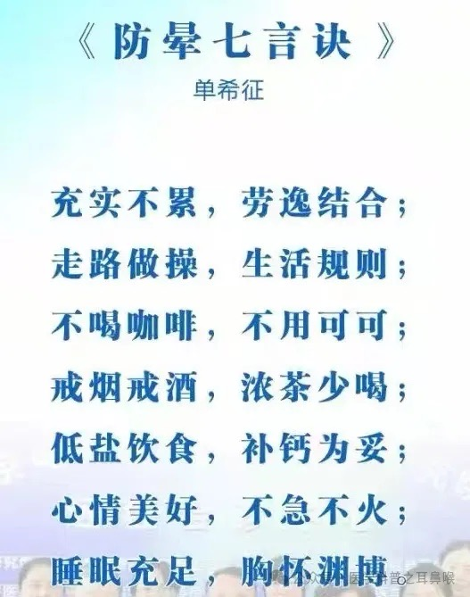 温馨提示:耳石症的复发率约10%-15%,但通过规范复位、坚持康复训练和规律生活,大部分患者是可以治愈的。“防晕七言诀”可以记下来:
