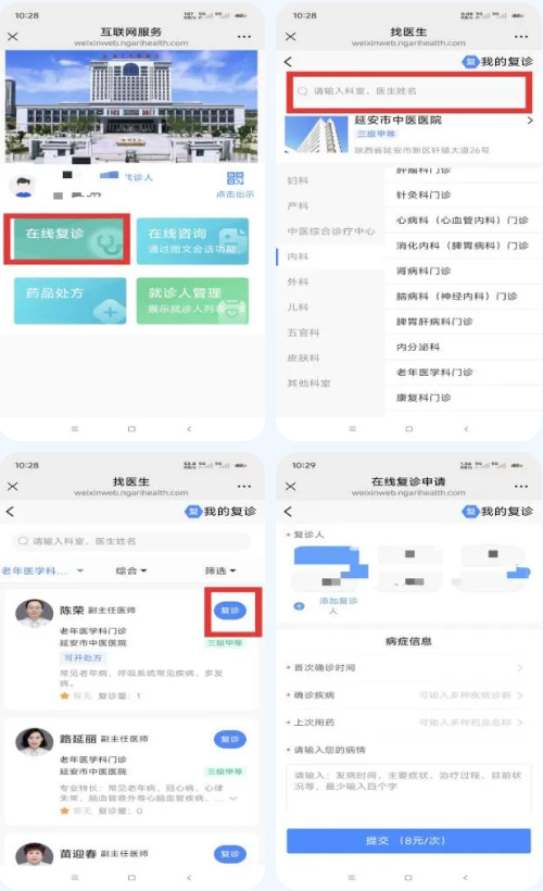 关注“延安市中医医院北医三院延安分院”微信公众号,点击菜单栏“医疗业务→互联网医院→互联网首页”,即可进入在线诊疗平台,可以根据自己的需要选择相应服务。