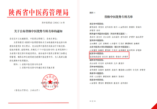 近日,陕西省中医药管理局公布省级中医优势专科名单,延安市中医医院(北京大学第三医院延安分院)感染性疾病科、针灸科、康复科、骨伤科和护理学等5个专科凭借扎实的学科基础、鲜明的中医特色、突出的临床治疗及完善的人才梯队,成功跻身省级中医优势专科行列。