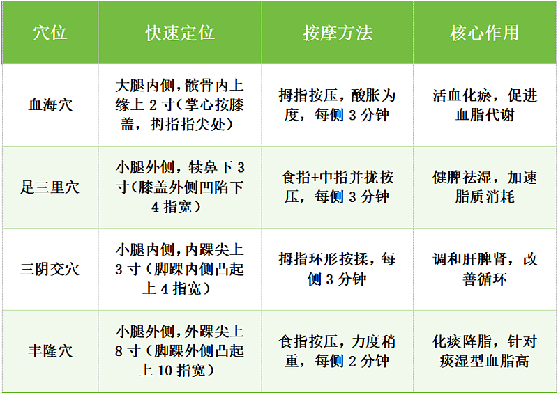 血海三里三阴交,丰隆穴位不可少;按揉酸胀为标准,每日两次效果好。