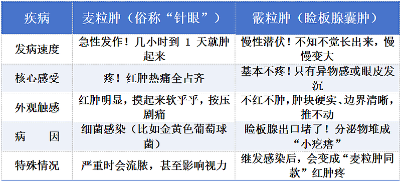 熬夜追剧后,不少人眼皮会突然肿个包——有人疼得睁不开眼,有人只觉得磨得慌,这大概率是麦粒肿或霰粒肿在“作祟”。麦粒肿和霰粒肿是日常生活中较为常见的眼睑疾病,虽然都长在眼睑上,但二者“脾气”完全不同,在病因、症状表现和治疗方法上有明显区别,搞错治疗方法可能越治越糟!