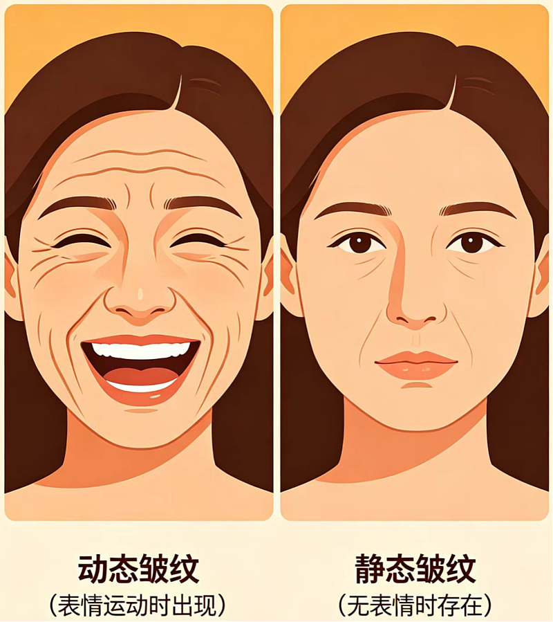 就是我们开头说的,做表情时才会出现的纹路。它的核心成因,是我们日常皱眉、笑、抬眉的时候,面部表情肌会反复收缩,长期牵拉皮肤,就像一张纸反复折叠会留下折痕一样,慢慢就形成了纹路。如果早期不做规范干预,动态纹会越来越深,最终变成不做表情也消不掉的静态纹。