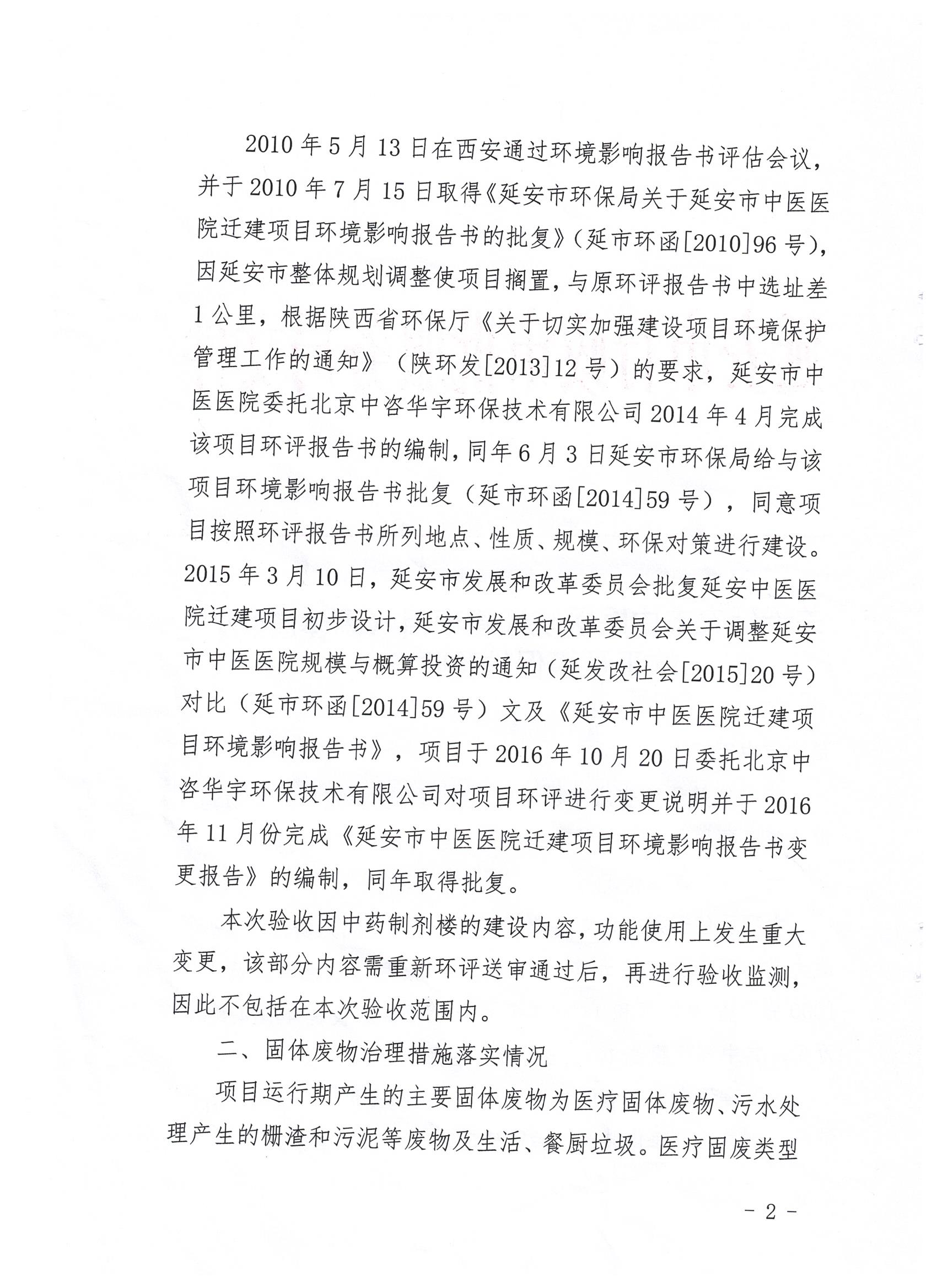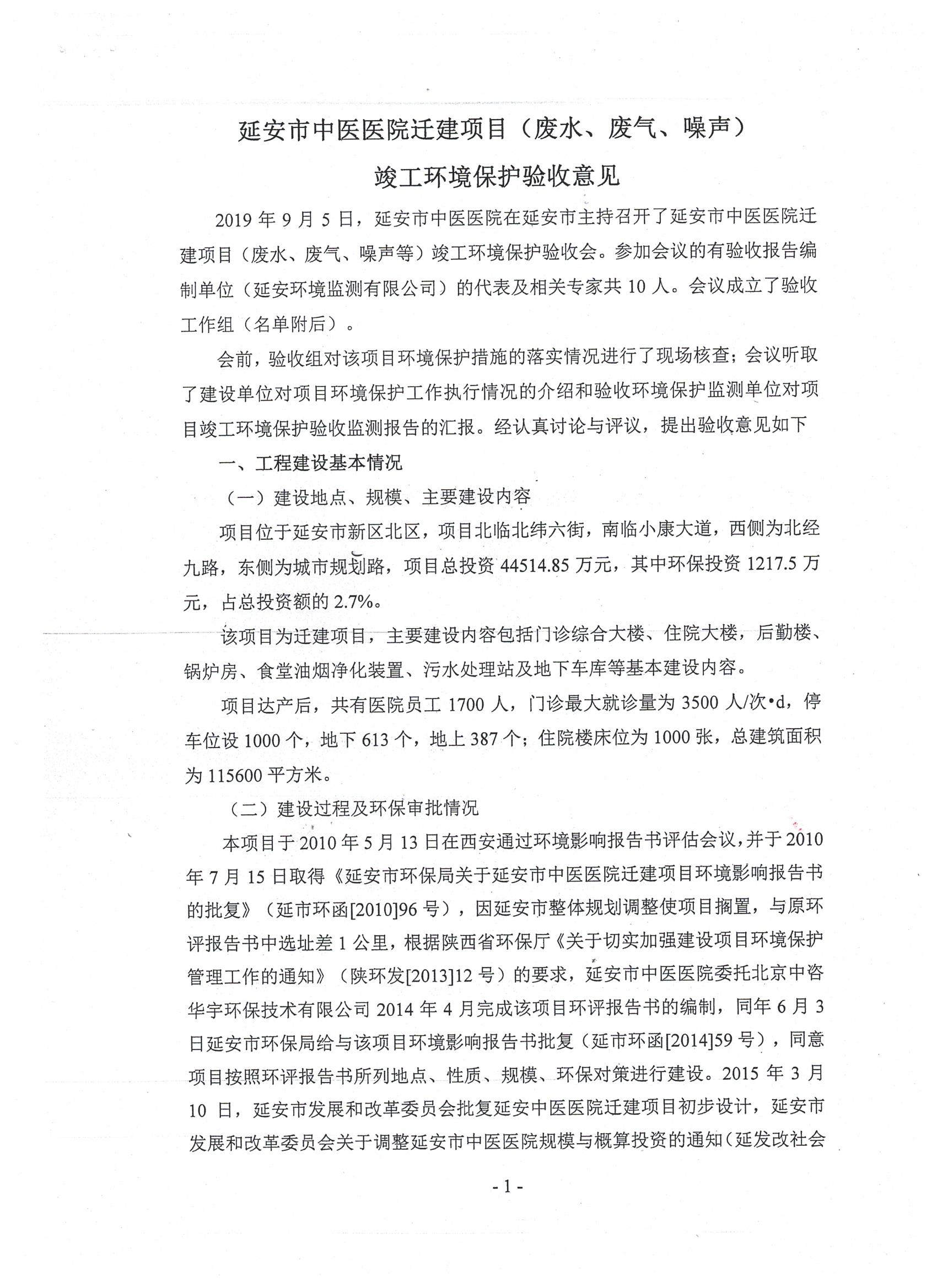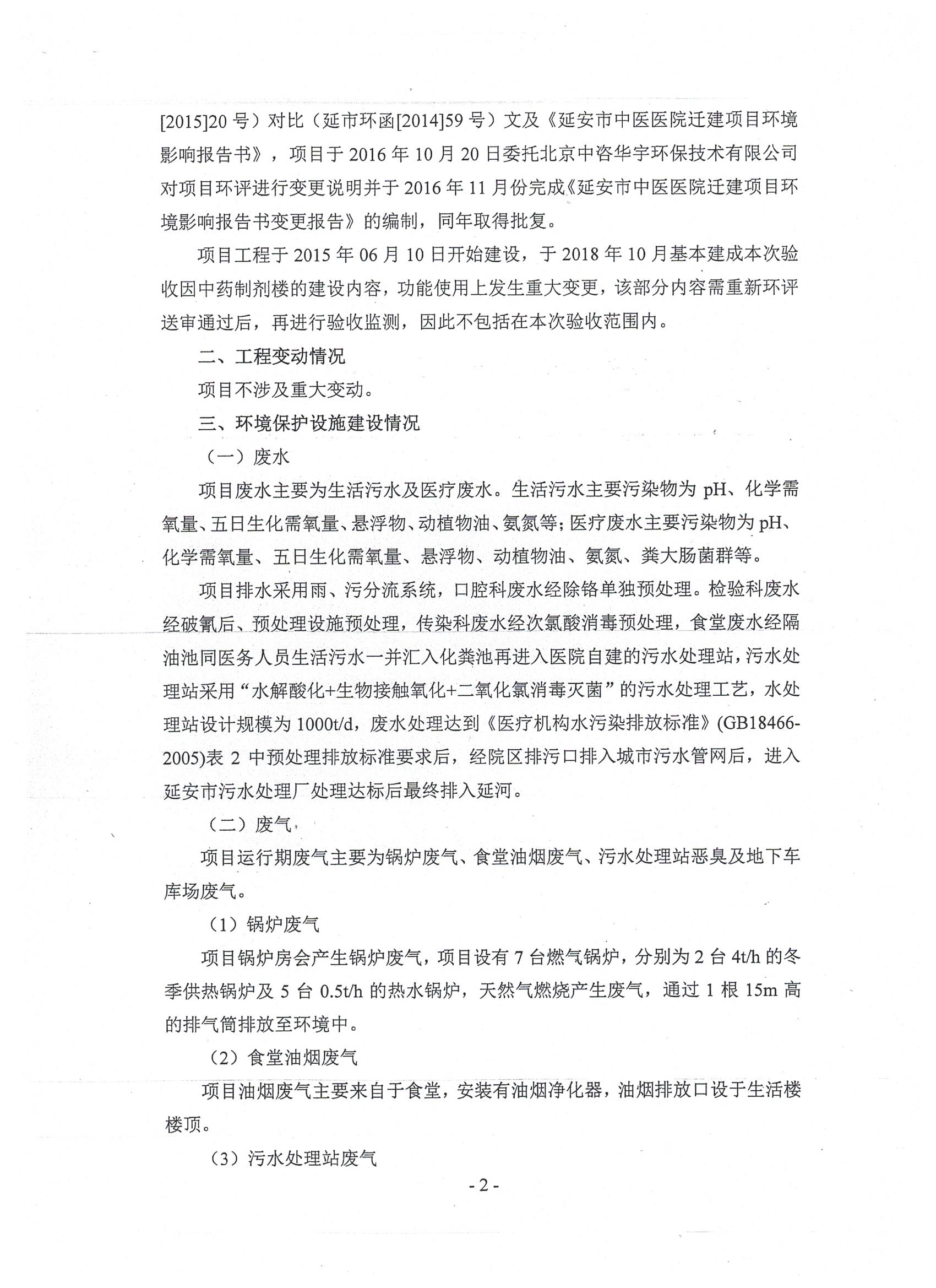 延安市中医医院迁建项目占地66353平方米,建筑面积共计115600平方米,绿化率36%,停车位1000个。项目总投资44514.85万元,其中环保投资1217.5万元,占总投资额的2.7%。主要建设内容包括门诊综合大楼、住院大楼、后勤楼、锅炉房、污水处理站及地下车库等。项目环评报告书由北京中咨华宇环保技术有限公司于2014年4月编制完成,同年6月3日延安市环保局给与该项目环境影响报告书批复(延市环函〔2014〕59号),项目于2016年10月20日委托北京中咨华宇环保技术有限公司对项目环评进行变更说明并于2016年11月份完成《延安市中医医院迁建项目环境影响报告书变更报告》的编制,同年取得批复。2019年9月23日市审批局组织在延安市中医医院召开竣工环境保护验收工作会议。依照国家有关法律法规、建设项目竣工环境保护验收技术规范、建设项目环境影响报告书和审批决定等要求对建设项目配套建设的环境保护设施进行验收,形成验收意见,现予以公开,公示时间为20个工作日,公示期间接受社会公众监督。