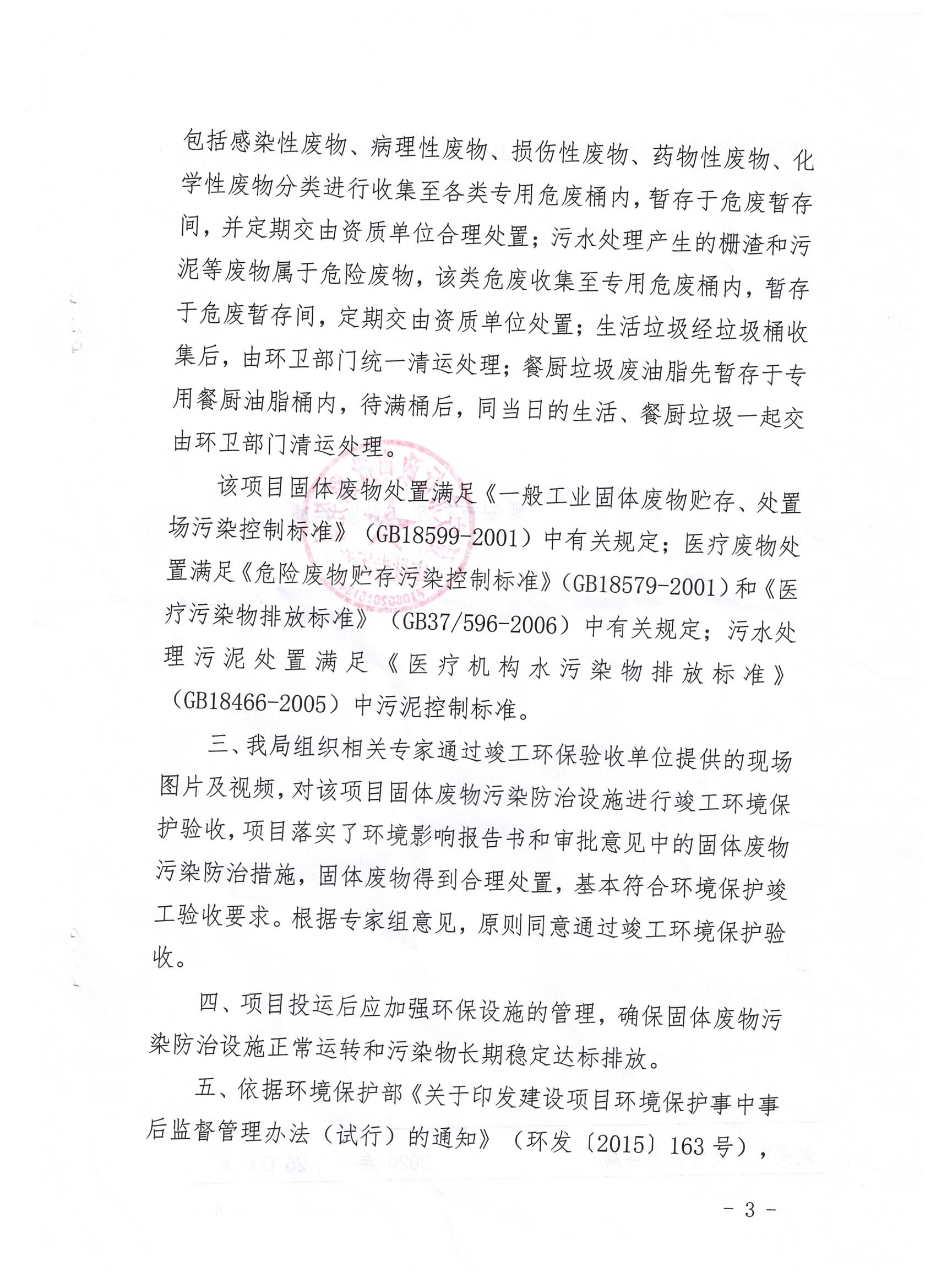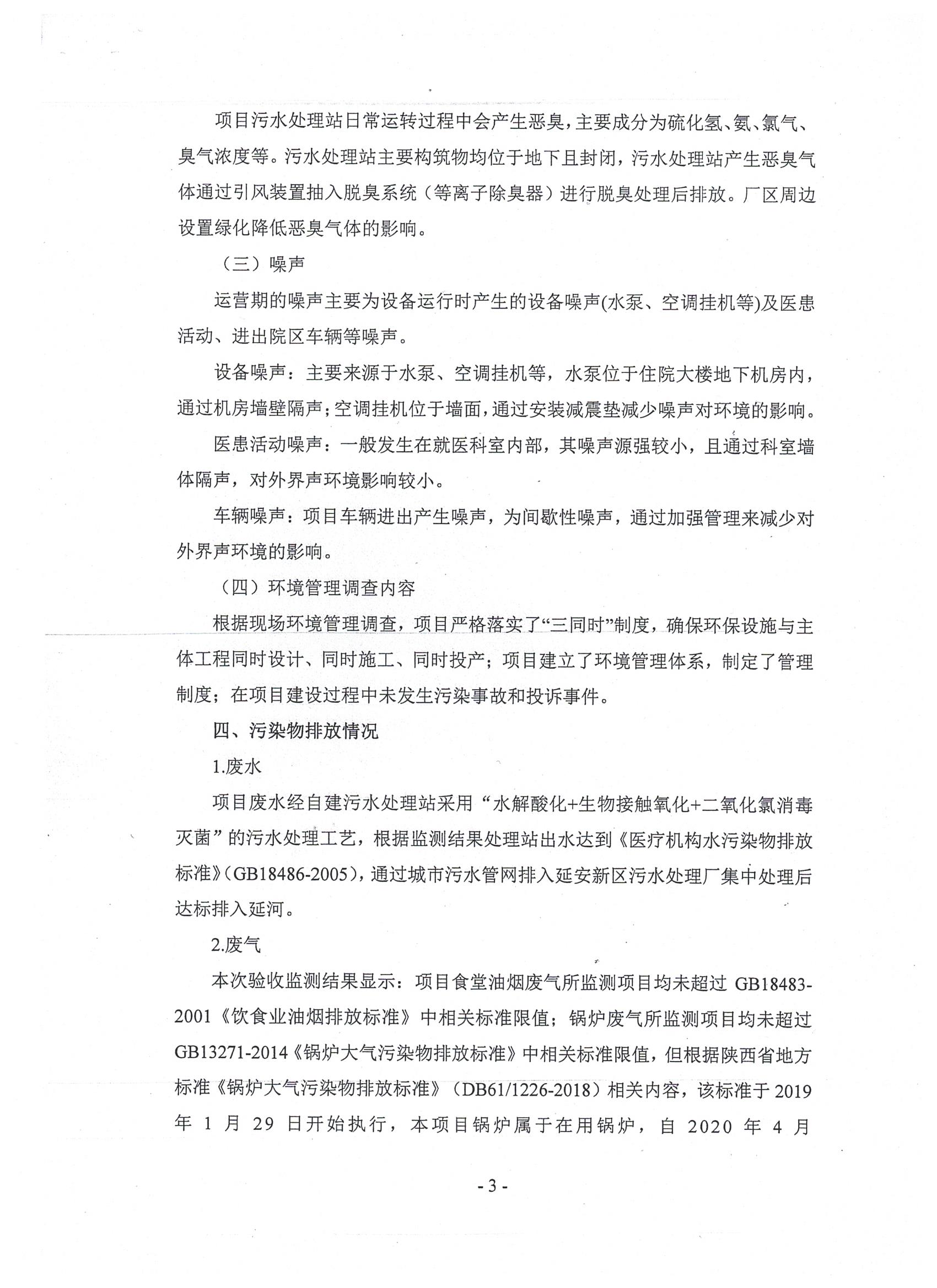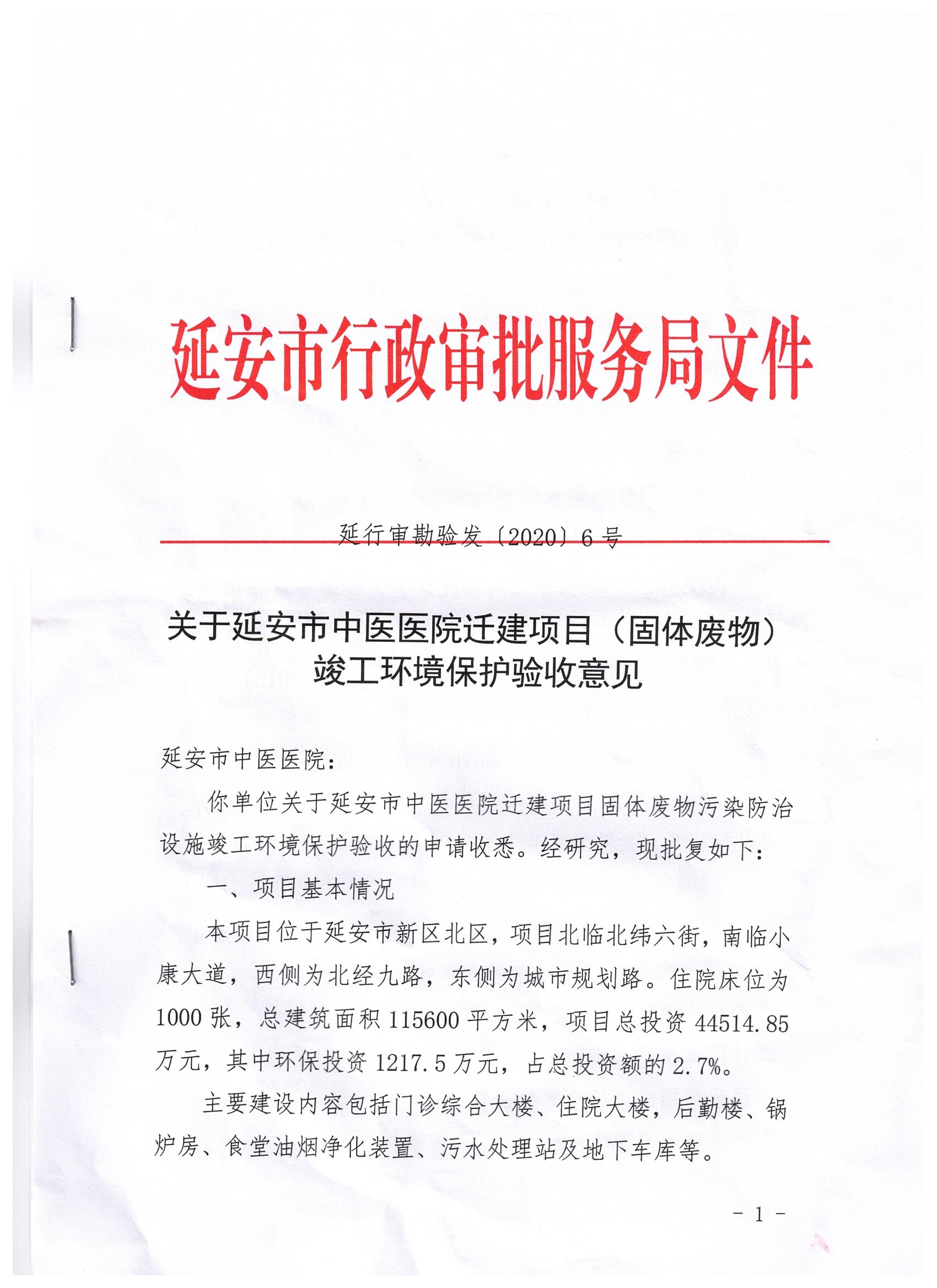 延安市中医医院迁建项目占地66353平方米,建筑面积共计115600平方米,绿化率36%,停车位1000个。项目总投资44514.85万元,其中环保投资1217.5万元,占总投资额的2.7%。主要建设内容包括门诊综合大楼、住院大楼、后勤楼、锅炉房、污水处理站及地下车库等。项目环评报告书由北京中咨华宇环保技术有限公司于2014年4月编制完成,同年6月3日延安市环保局给与该项目环境影响报告书批复(延市环函〔2014〕59号),项目于2016年10月20日委托北京中咨华宇环保技术有限公司对项目环评进行变更说明并于2016年11月份完成《延安市中医医院迁建项目环境影响报告书变更报告》的编制,同年取得批复。2019年9月23日市审批局组织在延安市中医医院召开竣工环境保护验收工作会议。依照国家有关法律法规、建设项目竣工环境保护验收技术规范、建设项目环境影响报告书和审批决定等要求对建设项目配套建设的环境保护设施进行验收,形成验收意见,现予以公开,公示时间为20个工作日,公示期间接受社会公众监督。