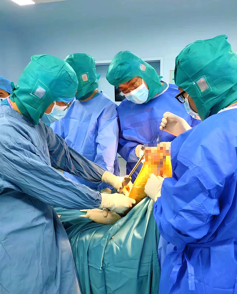 术前准备完善后,北京大学第三医院关节外科专家团队来到延安为三位患者实施了人工全膝关节表面置换术。术中克服了因骨质疏松、患肢僵直、畸形、周围肌肉萎缩等引起的术中截骨、下肢力线纠正、假体安放位置等诸多难题,为他们顺利植入了仿生的人工假体。