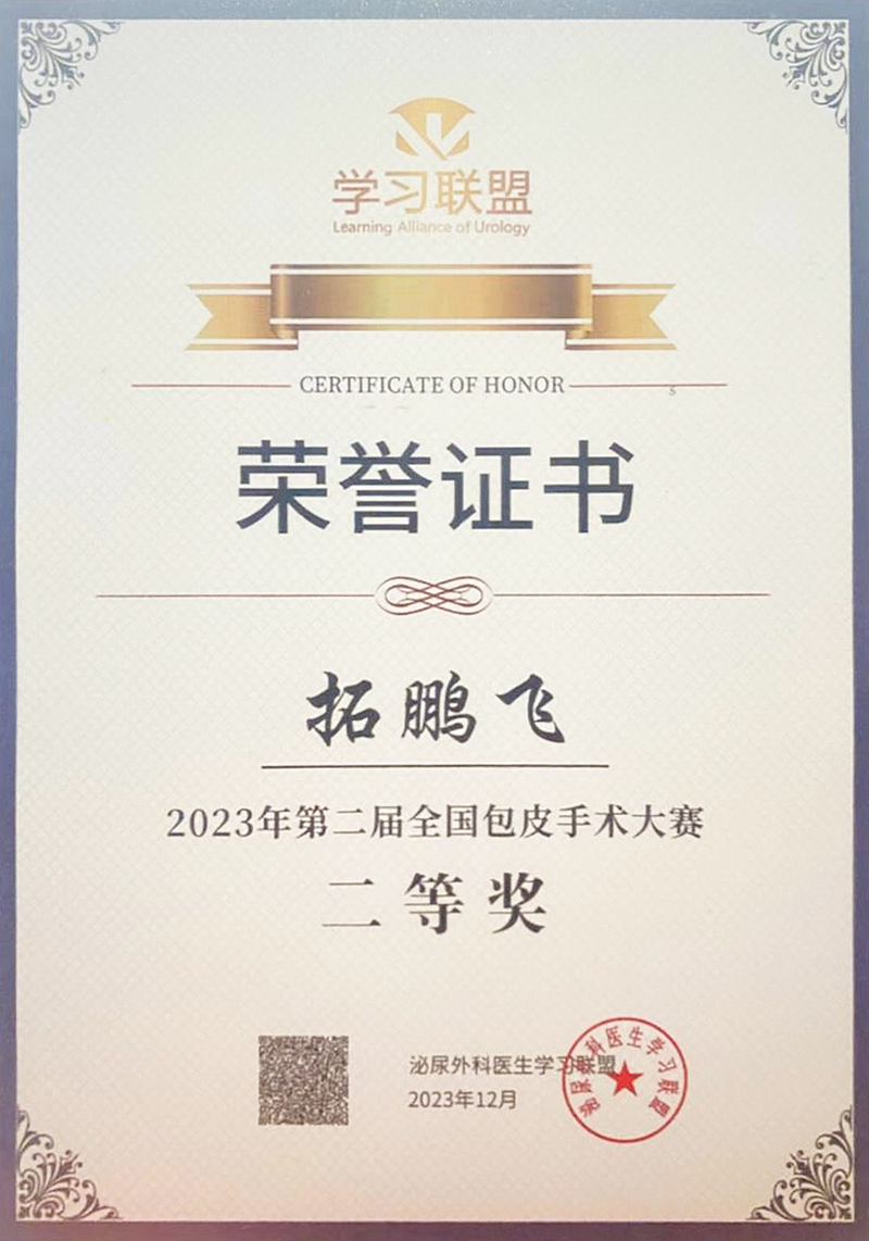 近日,在2023年泌尿外科医生学习联盟举办的“第二届全国包皮手术大赛”上,延安市中医医院(北京大学第三医院延安分院)泌尿外科拓鹏飞副主任医师经初赛、复赛、决赛层层选拔,在全国各地参赛选手中崭露头角,荣获大赛二等奖。