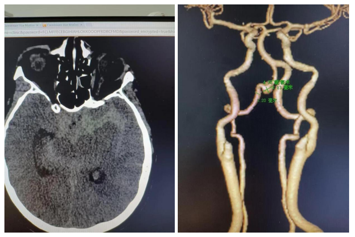 50岁的女性患者突然晕倒在地,右侧肢体活动受限,突然失语,拨打120经急诊紧急入院。急查颅脑CT、头颈CTA。CTA提示颅内多发动脉瘤。双侧大脑中动脉及右侧椎动脉各有一个动脉瘤,共有三枚动脉瘤。并进行了相关对症处理。脑外科田德洲主任及董永军副主任医师参与急会诊。经检查认为,患者颅内动脉瘤破裂伴有蛛网膜下腔出血,考虑患者有高血压病史10年,最高血压190/120mmHg,如果不及时处理,后果不堪设想。脑外科治疗团队立即启动MDT线上会诊,邀请北医三院韩金涛教授会诊,决定为患者进行多发动脉瘤同期介入栓塞治疗。