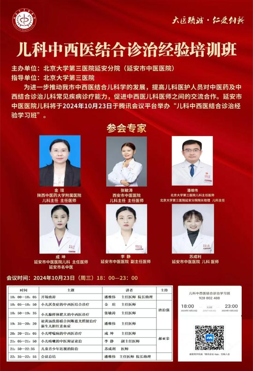 为分享儿童中西医结合诊治的最新知识进展,提高延安地区儿童中西医结合总体诊治水平,推动延安市儿童中西医结合学科发展。10月23日,延安市中医医院(北京大学第三医院延安分院)成功举办了“儿科中西医结合诊治经验培训班”。特邀陕西省中医药大学第一附属医院儿科金瑄主任医师、西安市中医医院儿科张敏涛主任医师、北京大学第三医院儿科潘维伟主任医师、延安市名中医、延安市中医医院成坤主任医师、儿科李静副主任医师、苏成利医师等多位专家分享了儿童相关疾病的中西医结合诊治理念和知识。120余位儿科同仁参加,共享线上学术盛宴。