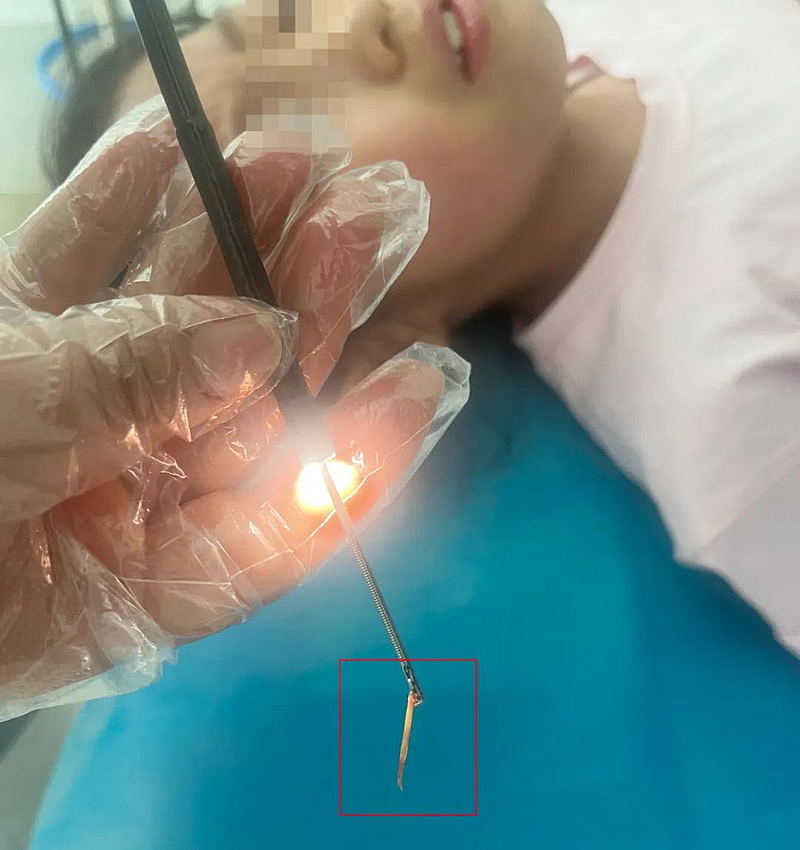 鉴于此处异物受角度限制,用异物钳夹取困难,且患儿年龄小、鼻腔窄,局麻下纤维喉镜经鼻径路异物取出难以配合。白有仁主任医师经多方考虑决定选择纤维喉镜经口取出异物。然而,经口操作易刺激舌根等咽反射敏感区,易引起患儿干呕,对操作者技术要求极高。经过充分准备,给患儿进行了表面麻醉,并指导患儿调整呼吸节奏配合。在白有仁主任医师和技师的默契配合下,顺利将管腔送入喉部,准确定位异物位置后,经管腔置入异物钳精准钳夹异物,将刺顺利取出。再次进行喉镜检查,局部未见粘膜损伤、出血、血肿等情况。孩子的家属连连称赞:“白大夫医术高超,耐心细致,手到病除!感谢白医生救了孩子!”