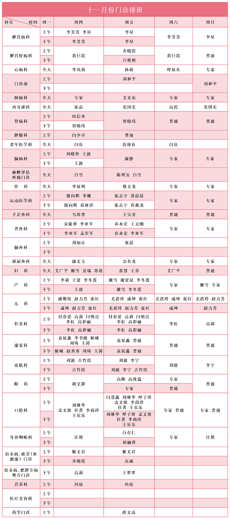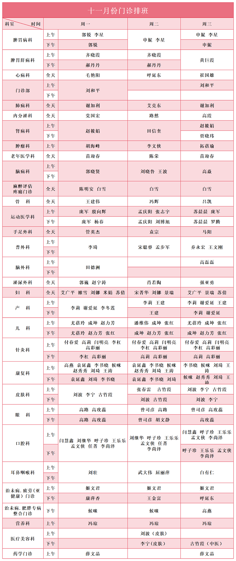 为了方便群众就医,延安市中医医院(北京大学第三医院延安分院)11月门诊排班表来啦!我院实行无假日门诊,患者可正常办理出入院手续,为您的健康保驾护航。