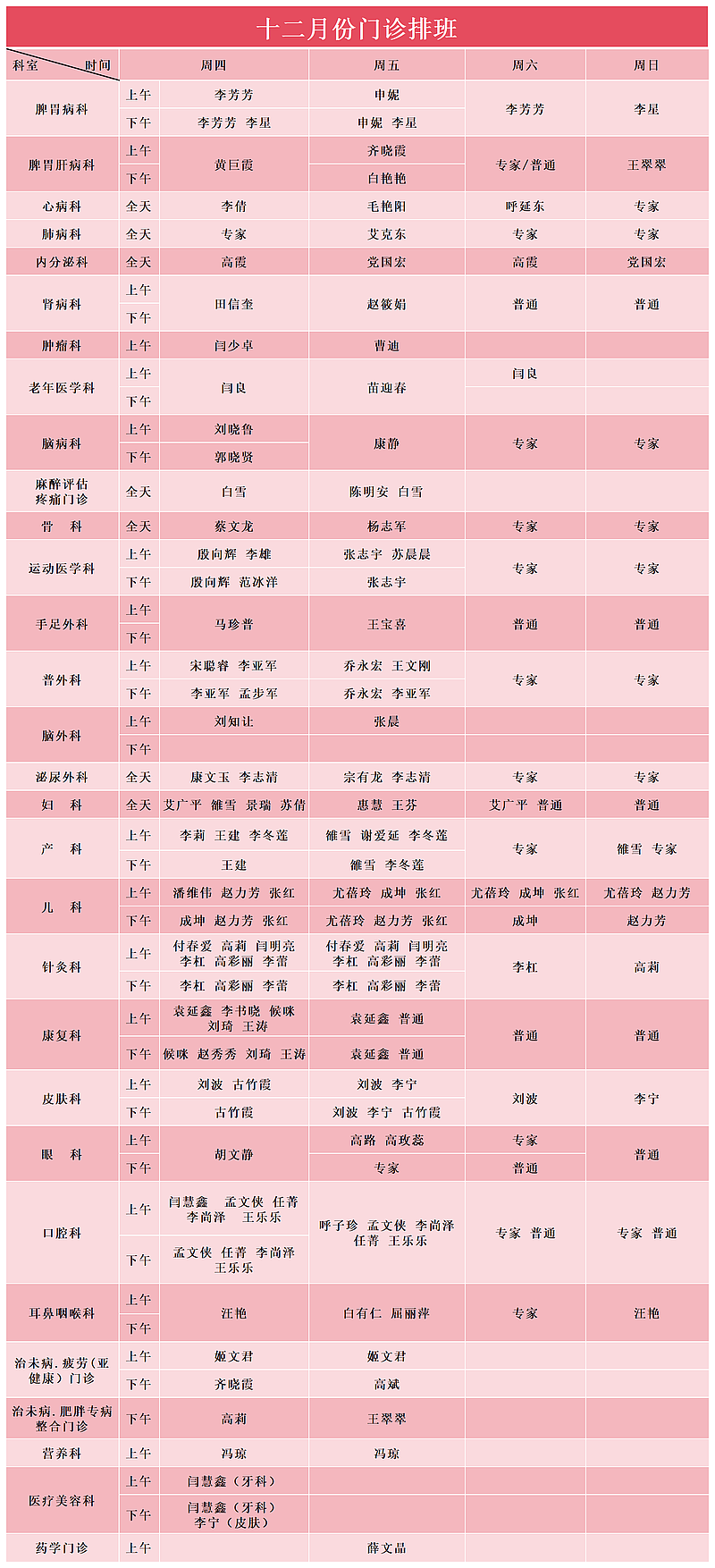 12月份门诊排班