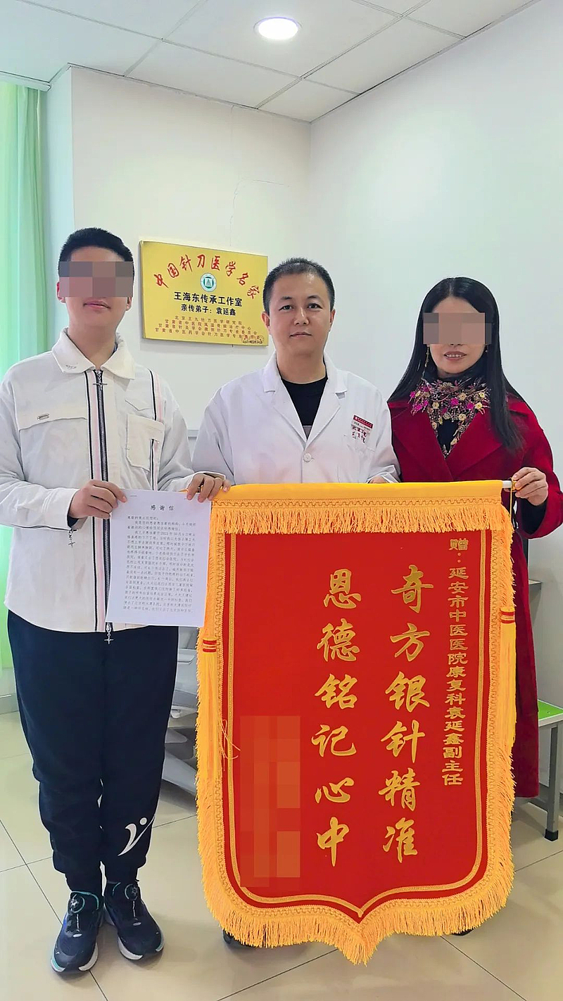 近日,在延安市中医医院(北京大学第三医院延安分院)康复科发生了温馨的一幕。患者及其家属专程将锦旗和感谢信送到康复科副主任袁延鑫手中。“奇方银针精准,恩德铭记心中”锦旗饱含着他们对袁医生深深的感激之情,背后更藏着一段温暖人心、令人难忘的医患故事。
