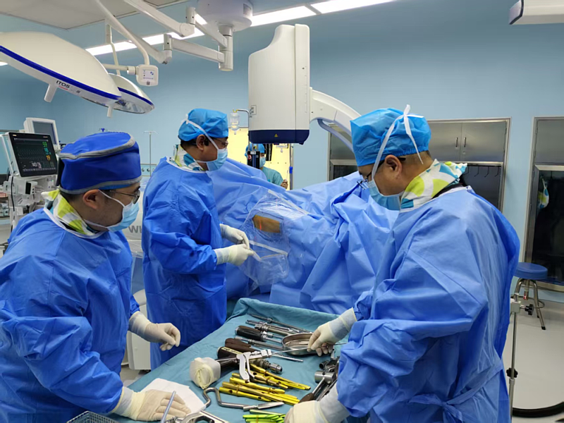 经过完善术前检查并征得家属同意后,在医院各科室的配合下,下午8点,手术正式开始。微创手术依赖G型臂X光机实时透视定位,主刀医生需全程穿戴铅衣防护辐射。铅衣密不透风,重量堪比负重训练,但医护团队早已习惯这种“铠甲加身”的工作日常。术中,患者的骨质疏松导致髓腔定位难度骤增,庞军主任手持导针在透视影像中反复调整角度,额头渗出的汗水模糊了护目镜。麻醉师紧盯监护仪动态,巡回护士精准传递器械,团队每一个指令都如齿轮咬合般严丝合缝。