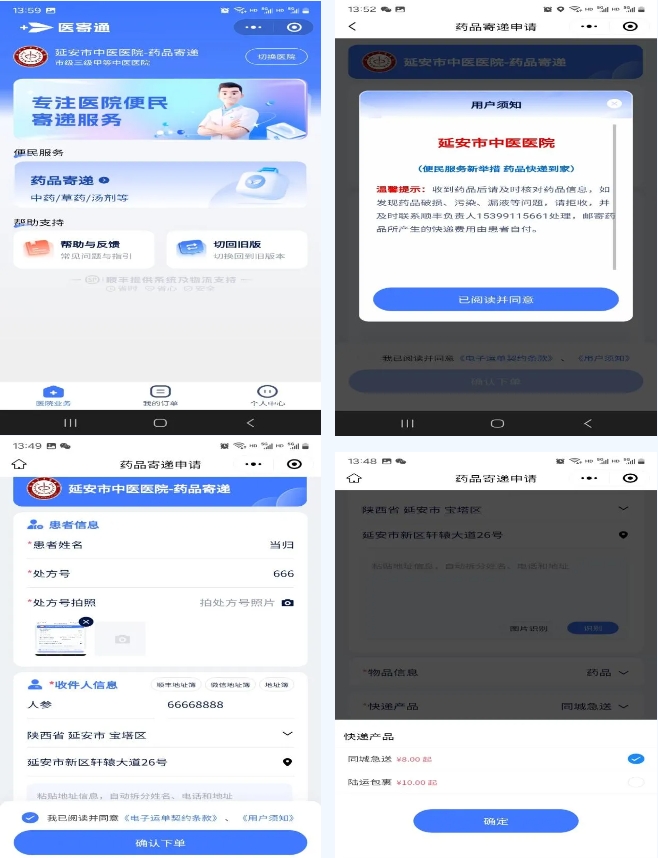以往患者需要在医院等待取药,通常上午就诊下午才能拿到药,下午就诊则要等到第二天才能取到药,在医院等候煎药的时间对于患者来说非常漫长。为改善群众就医体验,延安市中医医院(北京大学第三医院延安分院)推出“药品邮寄到家便民服务”,来院就诊的患者在看诊结束后可以扫描“顺丰快递服务”小程序二维码进行操作,药品将由顺丰快递配送上门,不用在药房苦苦等候!