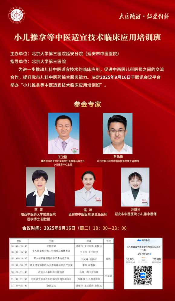 近日,由延安市中医医院(北京大学第三医院延安分院)儿科主办的 “小儿推拿等中医适宜技术临床应用培训班”顺利举办。本次培训聚焦中医适宜技术在儿科临床的规范化应用与推广,旨在为儿科医护人员、推拿师、康复治疗师及中医药爱好者搭建学习交流平台,通过系统授课提升从业人员专业技能,为儿童健康提供更具特色的中医诊疗方案。培训采用腾讯会议线上形式开展,吸引了来自200余名相关从业者参会,会议由我院儿科副主任屈辉与儿科副主任医师张丽娜共同主持。