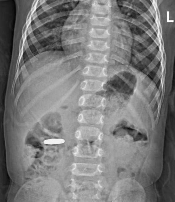 急诊的X光检查很快给出了明确结果:在童童上腹部区域,清晰显示出一个典型的椭圆形金属密度影,正是那枚“失踪”的硬币。万幸的是,这枚硬币形状规则、边缘光滑,没有尖锐凸起,大大降低了对肠道黏膜的划伤风险。医生结合童童当时无腹痛、呕吐等不适的状态判断,硬币大概率能随着肠道蠕动自行排出体外,无需立即手术干预。
