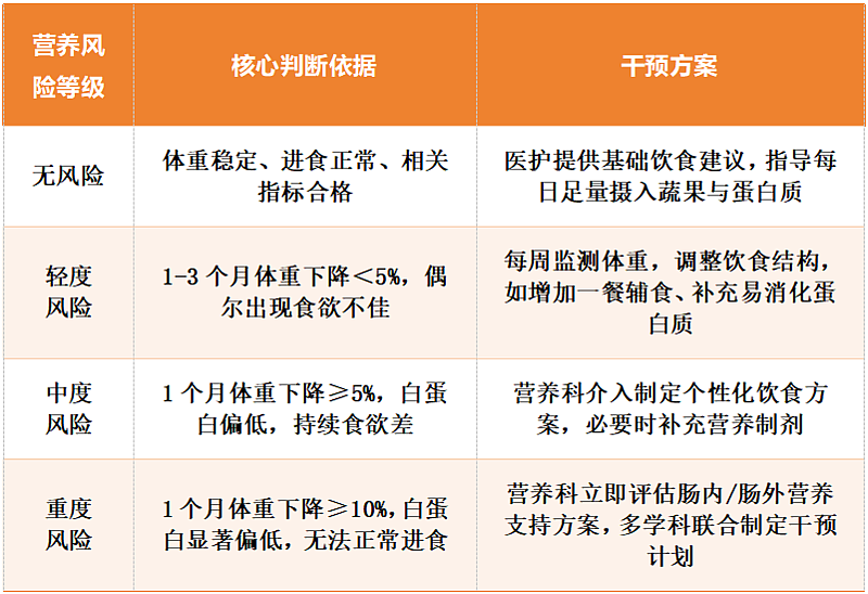 术前重点关注体重、白蛋白水平,预判患者伤口愈合能力;胃肠手术前专项评估消化功能,为术后营养支持提前铺垫。
