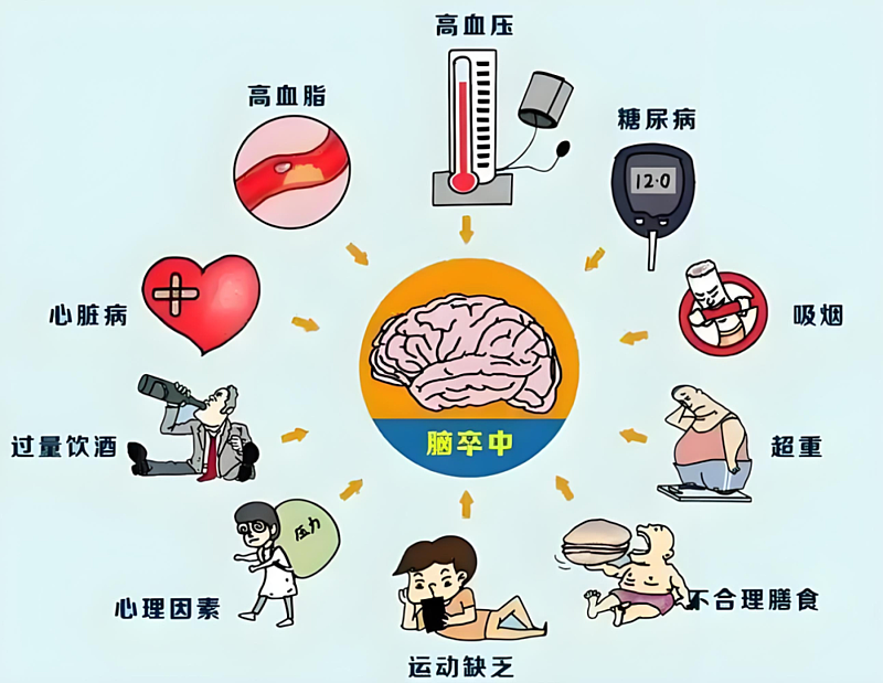 1.卒中预防是关键,需重点管控可干预危险因素。主要包括高血压、糖尿病、血脂异常、心脏病(含心房颤动)等慢性疾病,以及吸烟、过量饮酒、超重或肥胖、缺乏运动、长期心理失衡等不良状态。