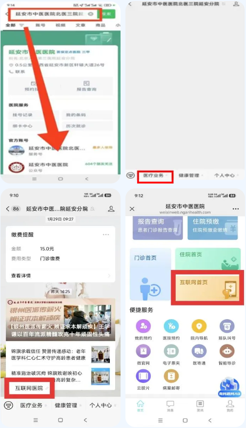 关注“延安市中医医院北医三院延安分院”微信公众号,点击菜单栏“医疗业务→互联网医院→互联网首页”,即可进入在线诊疗平台,可以根据自己的需要选择相应服务。