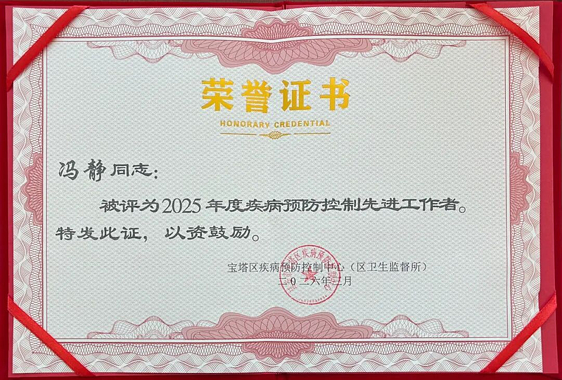 近日,宝塔区疾病预防控制中心(区卫生监督所)公布2025年度疾病预防控制工作表彰结果,延安市中医医院(北京大学第三医院延安分院)疾病预防控制科凭借扎实的工作成效,获评“2025年度疾病预防控制工作先进单位”;冯静同志荣获“2025年度疾病预防控制先进工作者”称号。双项荣誉既是区域疾控中心对我院疾控工作的高度认可与充分肯定,更凝聚着全院上下同心同德、并肩作战的辛勤付出与不懈坚守。