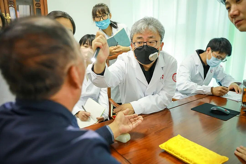 在风湿免疫科病区,王学谦老师对系统性红斑狼疮患者进行了细致诊查,逐一查看患者皮肤黏膜表现、脏腑功能状态及免疫抗体动态波动情况,结合患者当前身体状况与用药方案,立足银州医派学术思想,围绕“七冲门辨证、脉象辨识、苗窍调摄、阴阳调和”等特色诊疗思路,为患者制定了凉血解毒、养阴益肾、调和营卫的专属中药辅方,同时详细拆解辨证施治的关键思路、用药技巧与实操要点。